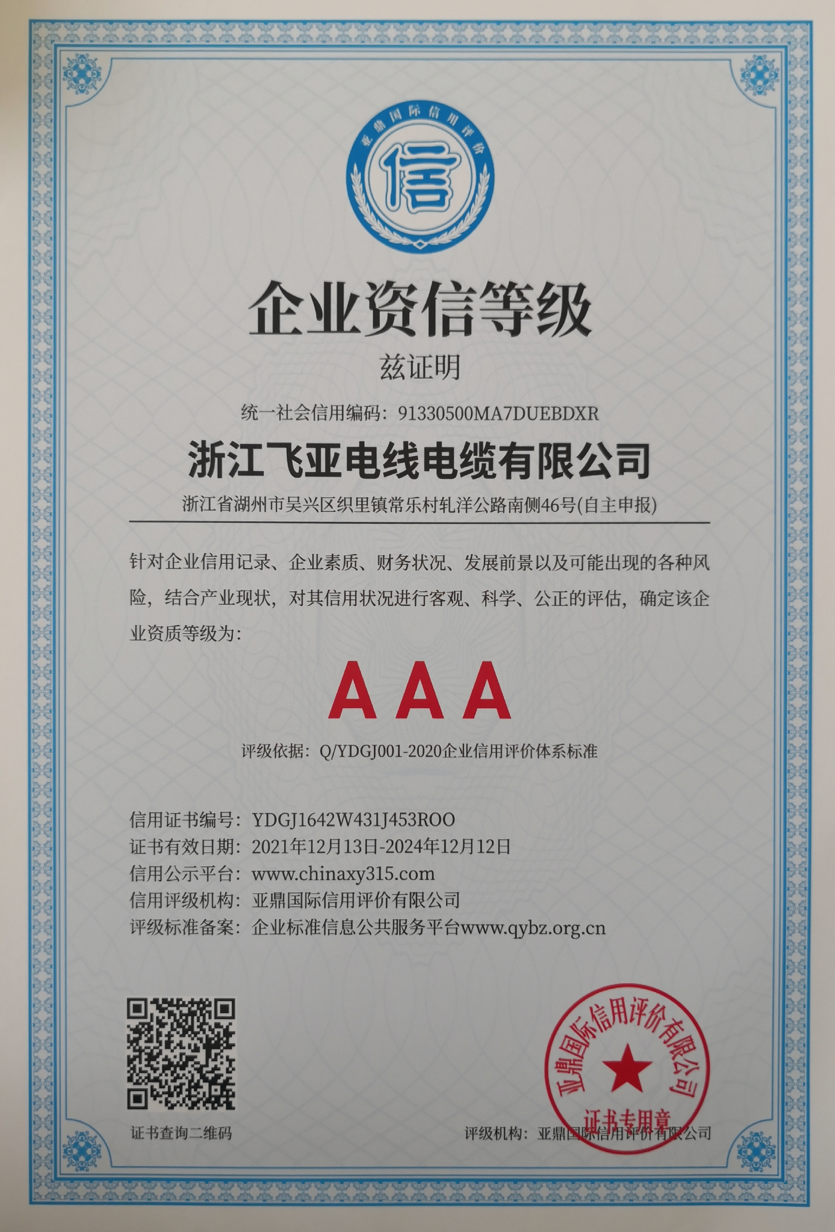 3A级企业资信登记证书